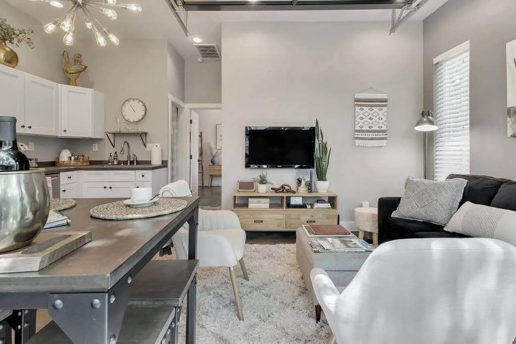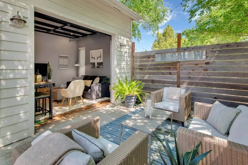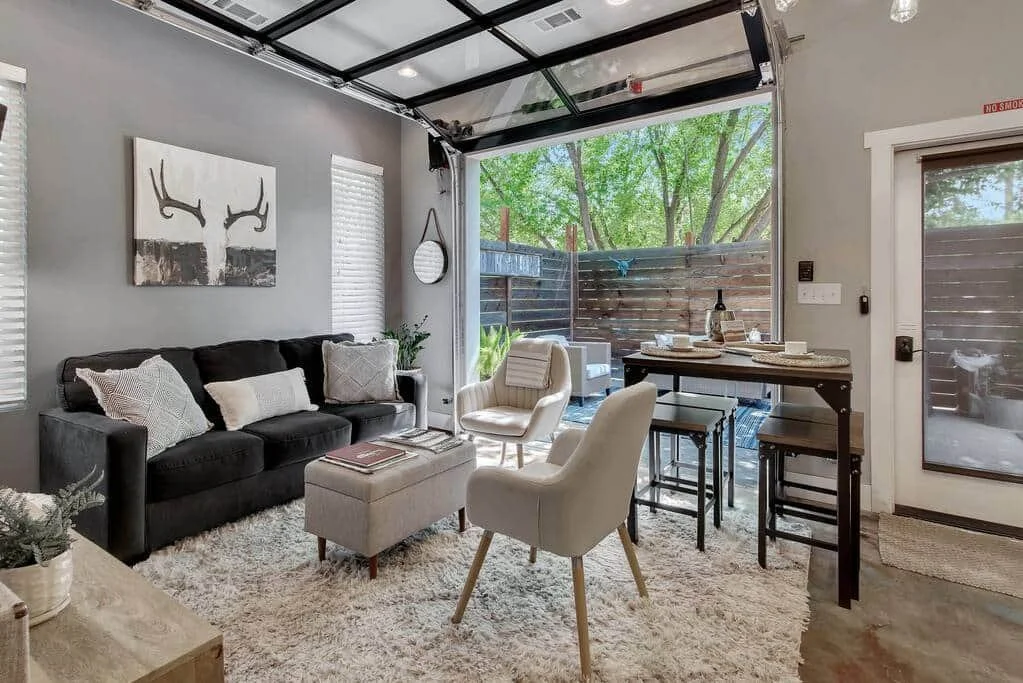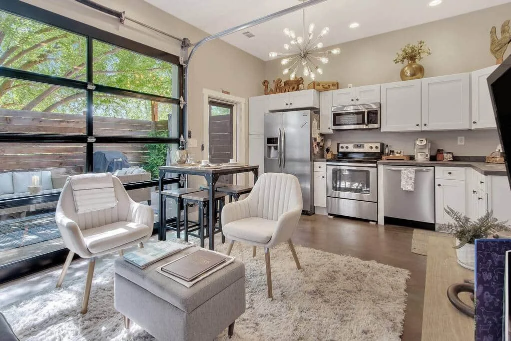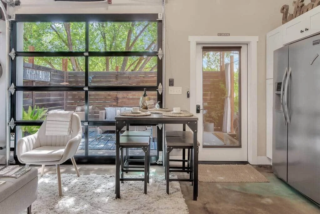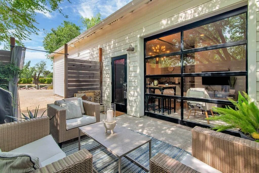 Stay in a private bungalow attached to a modern white farmhouse, blending urban country décor with all the comforts of home. Relax in the luxurious KING bed, cook in the fully stocked kitchen, or open the glass garage door to your own private patio with BBQ.