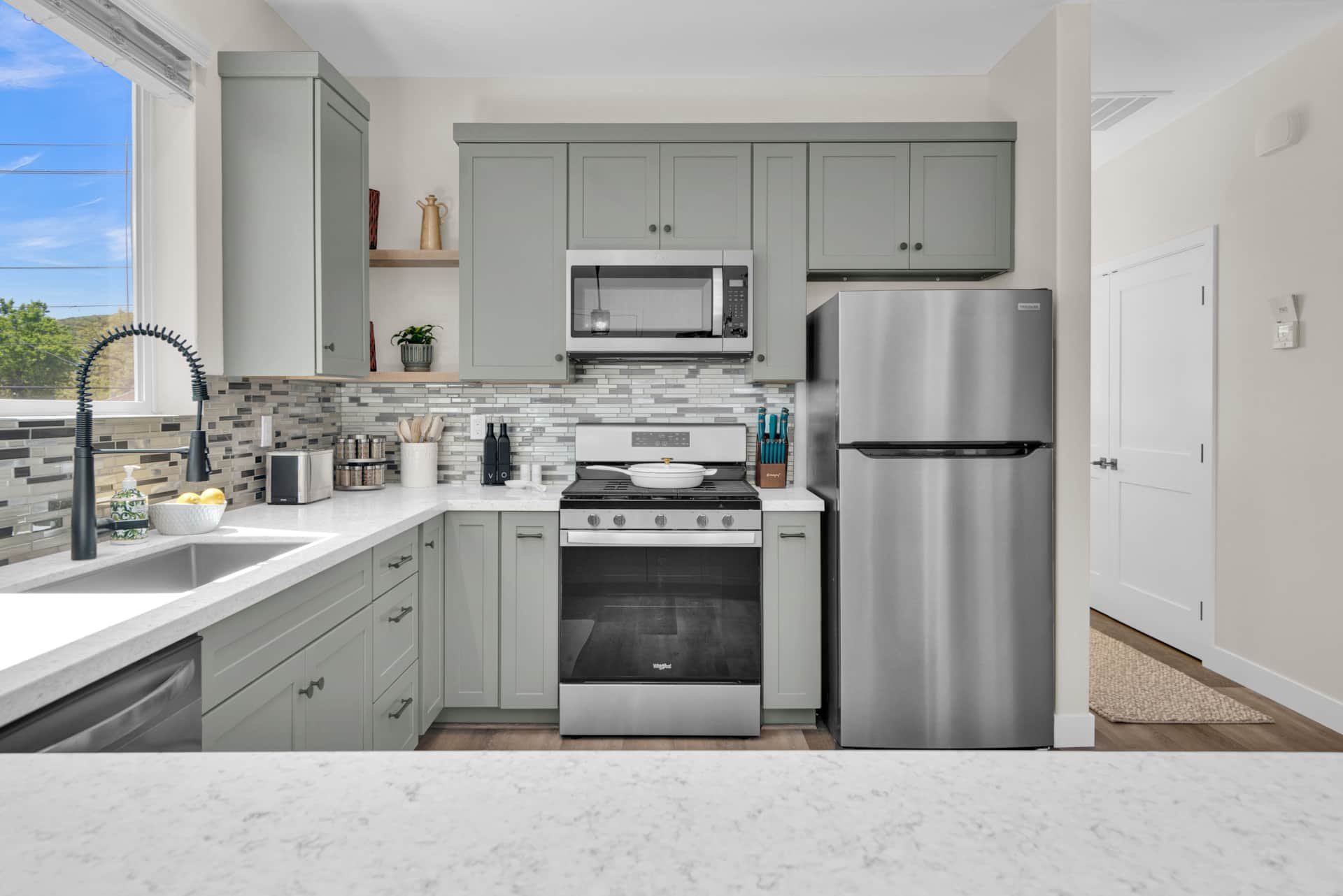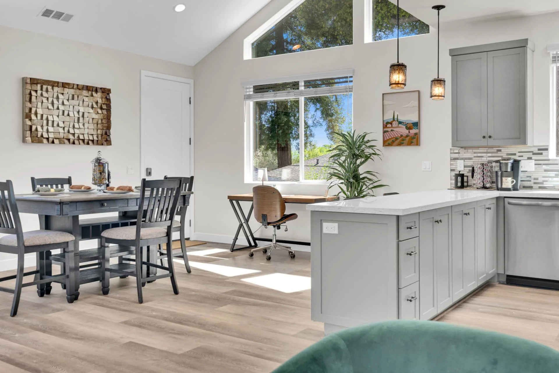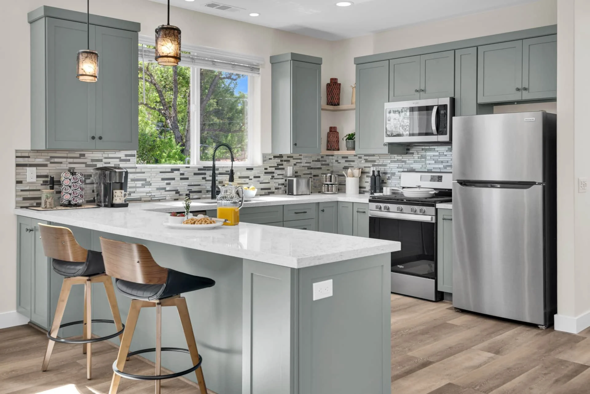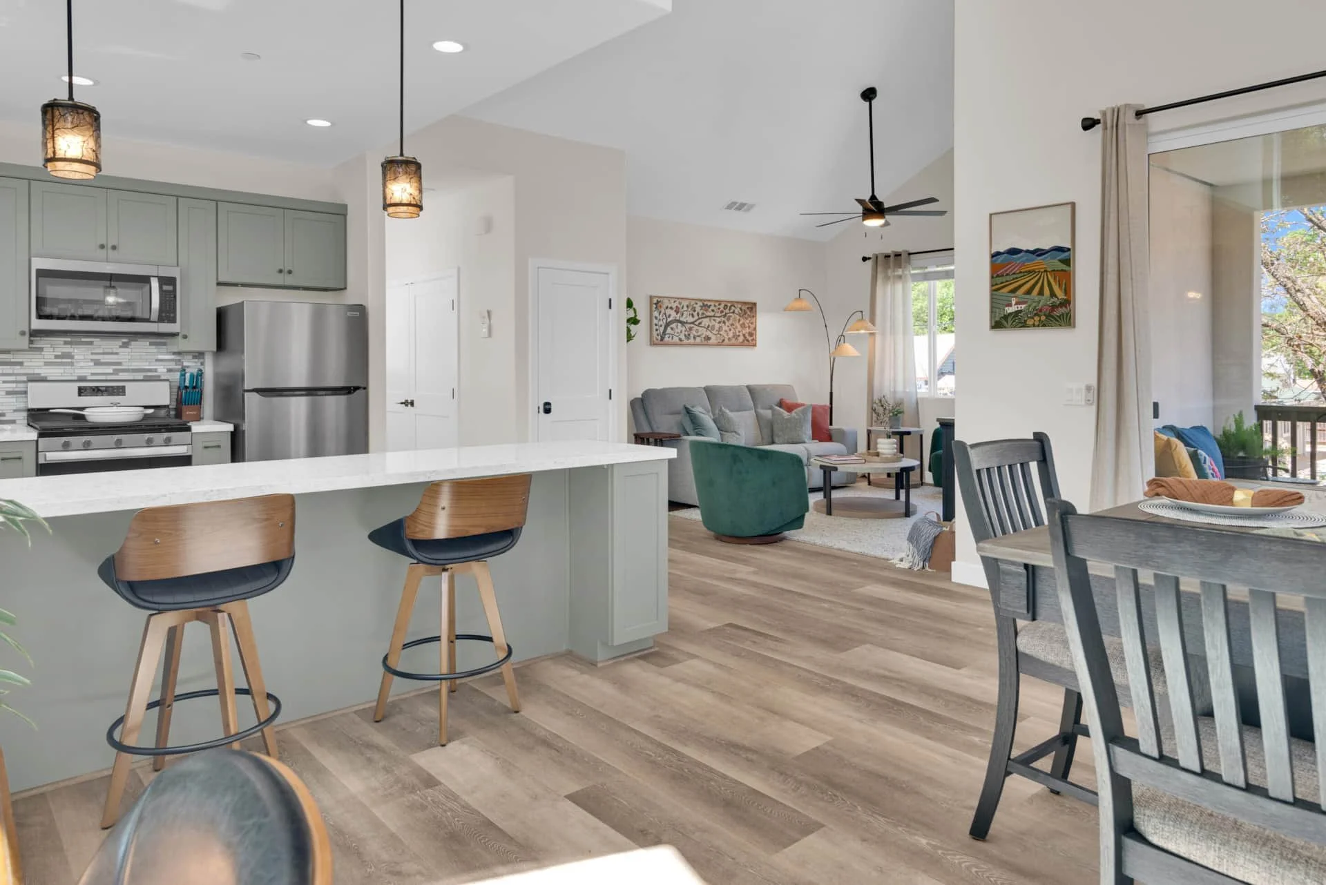 Step inside to an inviting space filled with natural light and thoughtful details. The dining room welcomes you with a table for four and a dedicated workspace beneath picture windows, while the living room provides a reclining couch, swivel chairs, Smart TV, and games for a cozy night in. The modern kitchen is fully equipped with stainless steel appliances, bar seating for two, and everything you need to cook a gourmet meal, from a Keurig and French press to a blender and toaster.