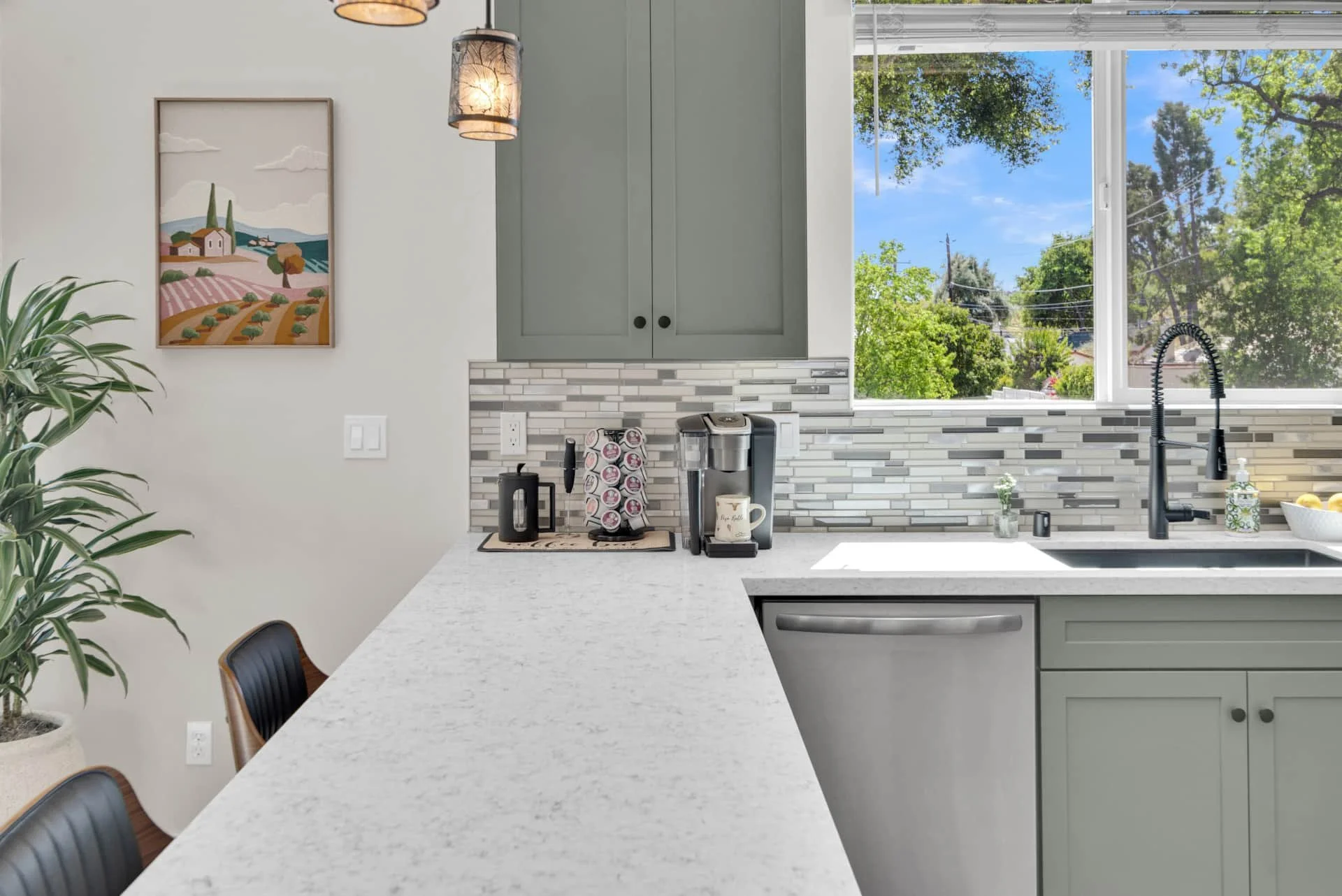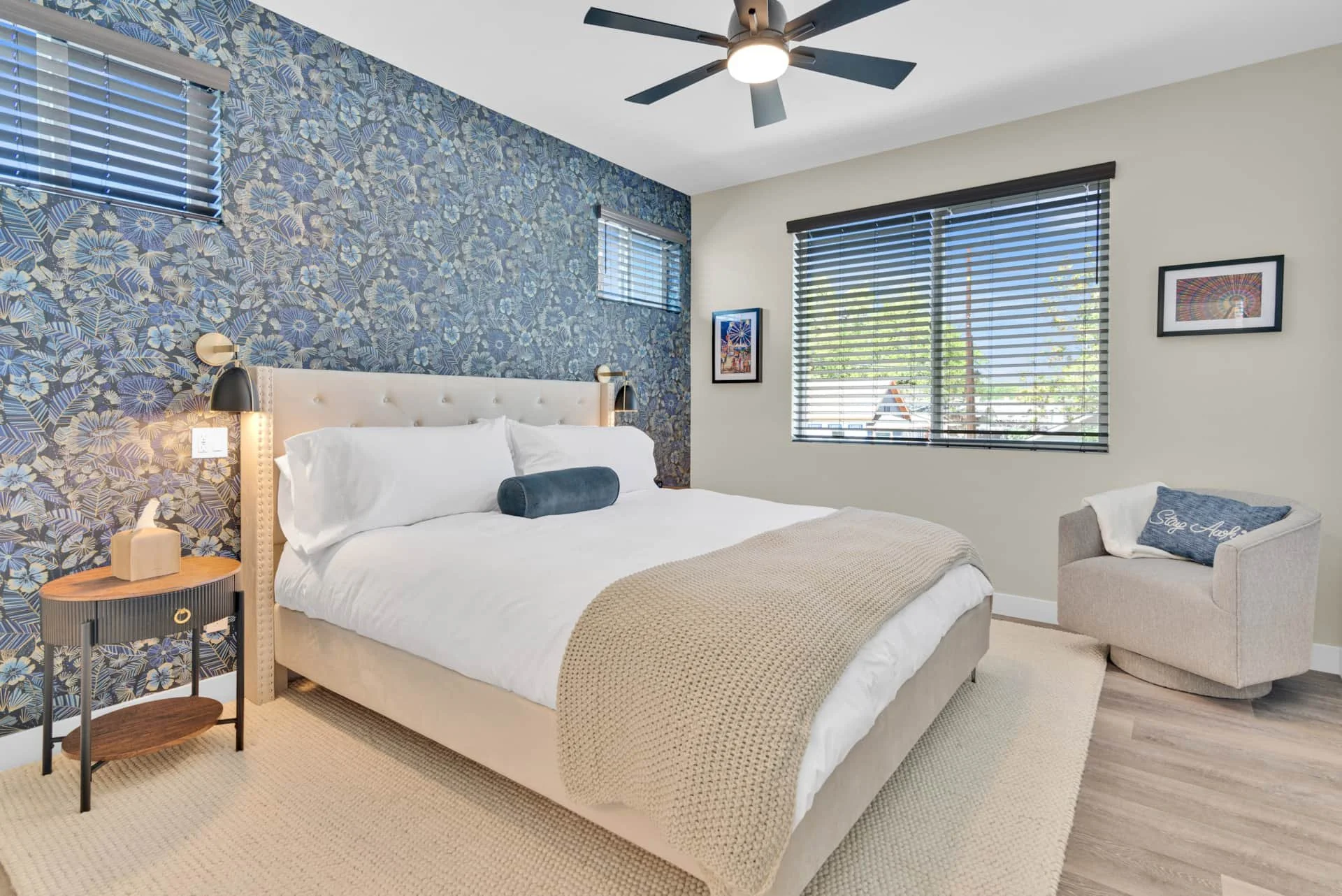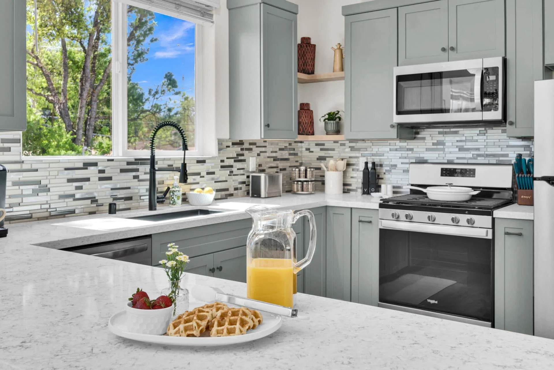 Step inside to an inviting space filled with natural light and thoughtful details. The dining room welcomes you with a table for four and a dedicated workspace beneath picture windows, while the living room provides a reclining couch, swivel chairs, Smart TV, and games for a cozy night in. The modern kitchen is fully equipped with stainless steel appliances, bar seating for two, and everything you need to cook a gourmet meal, from a Keurig and French press to a blender and toaster.