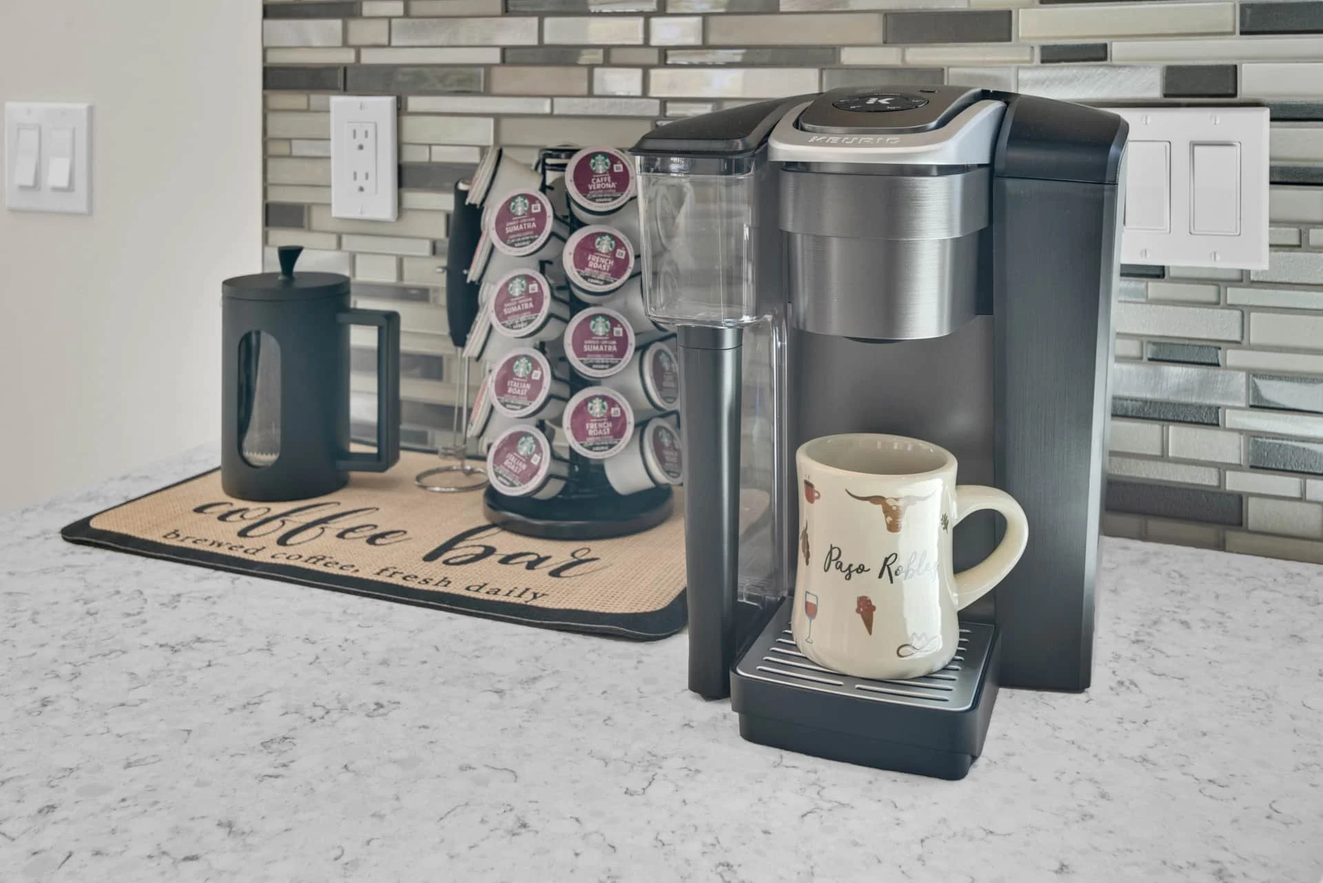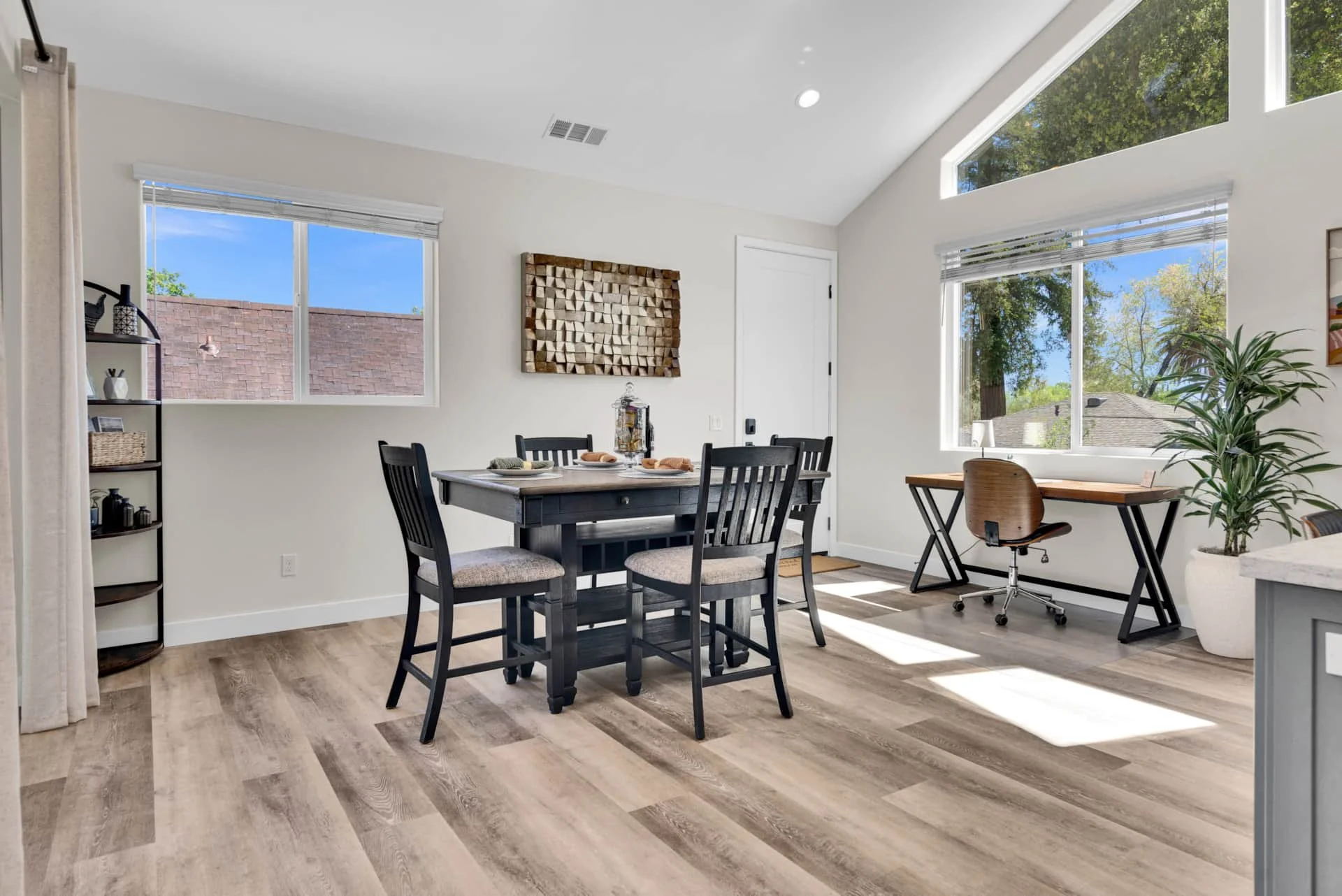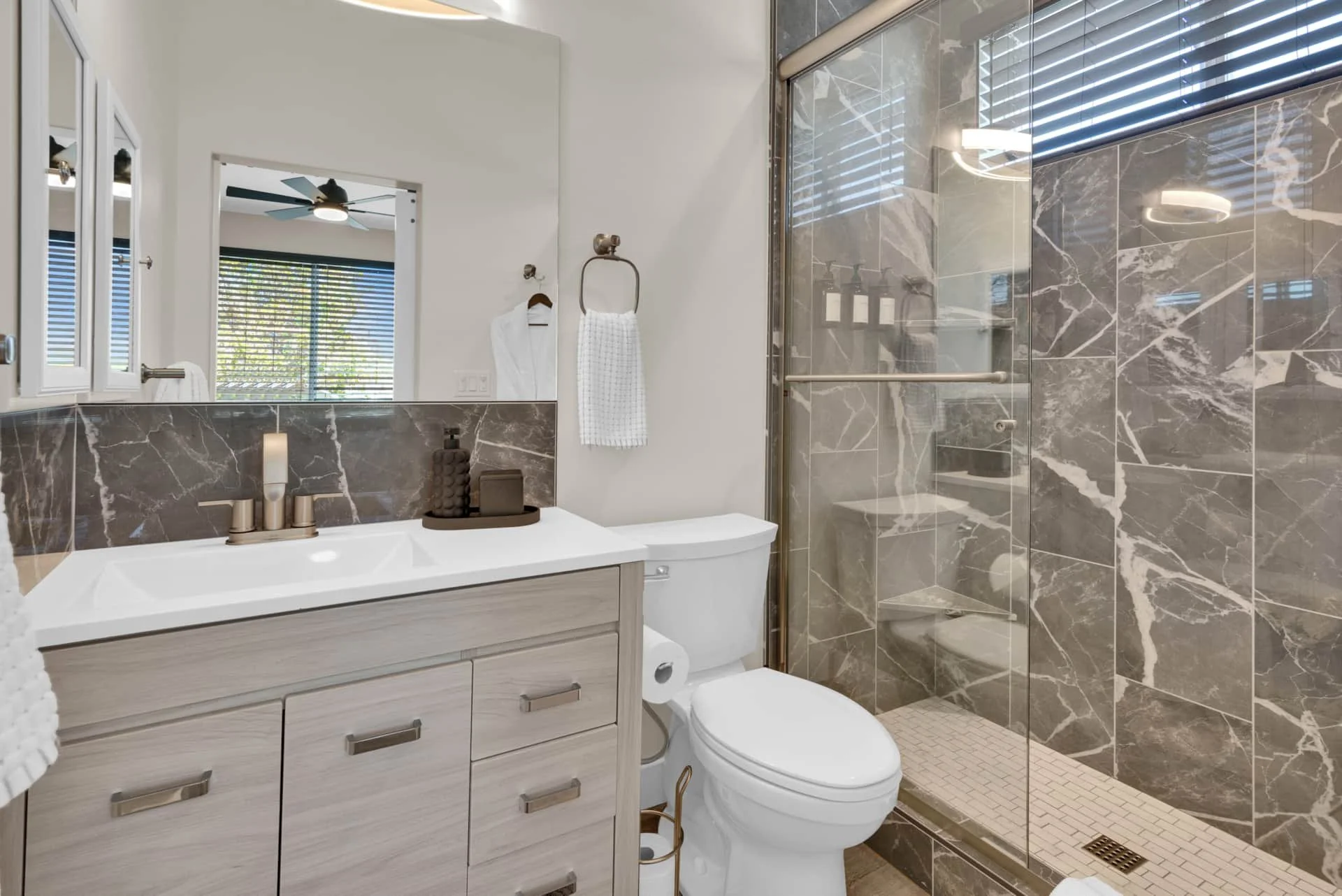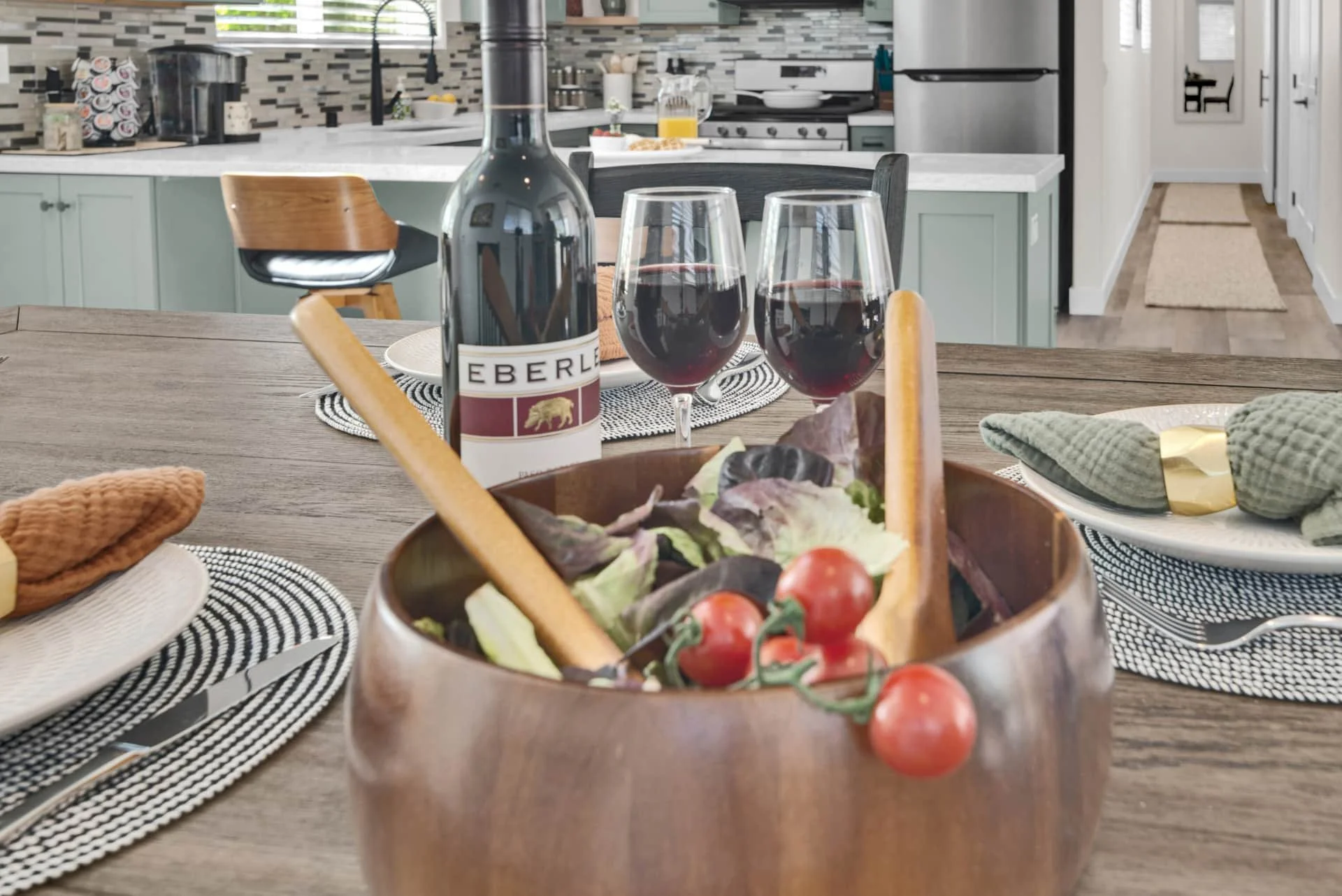 Step inside to an inviting space filled with natural light and thoughtful details. The dining room welcomes you with a table for four and a dedicated workspace beneath picture windows, while the living room provides a reclining couch, swivel chairs, Smart TV, and games for a cozy night in. The modern kitchen is fully equipped with stainless steel appliances, bar seating for two, and everything you need to cook a gourmet meal, from a Keurig and French press to a blender and toaster.