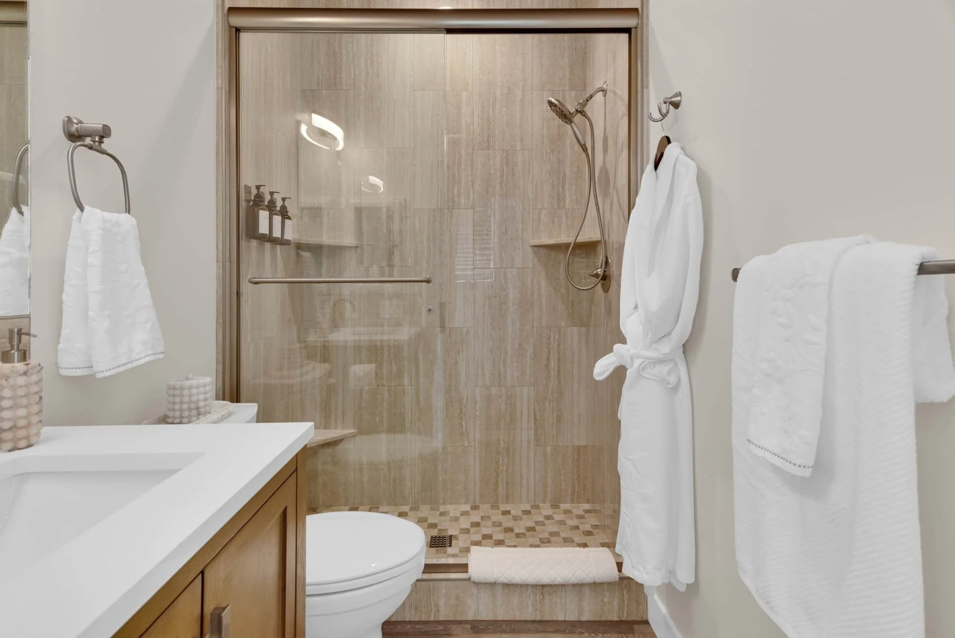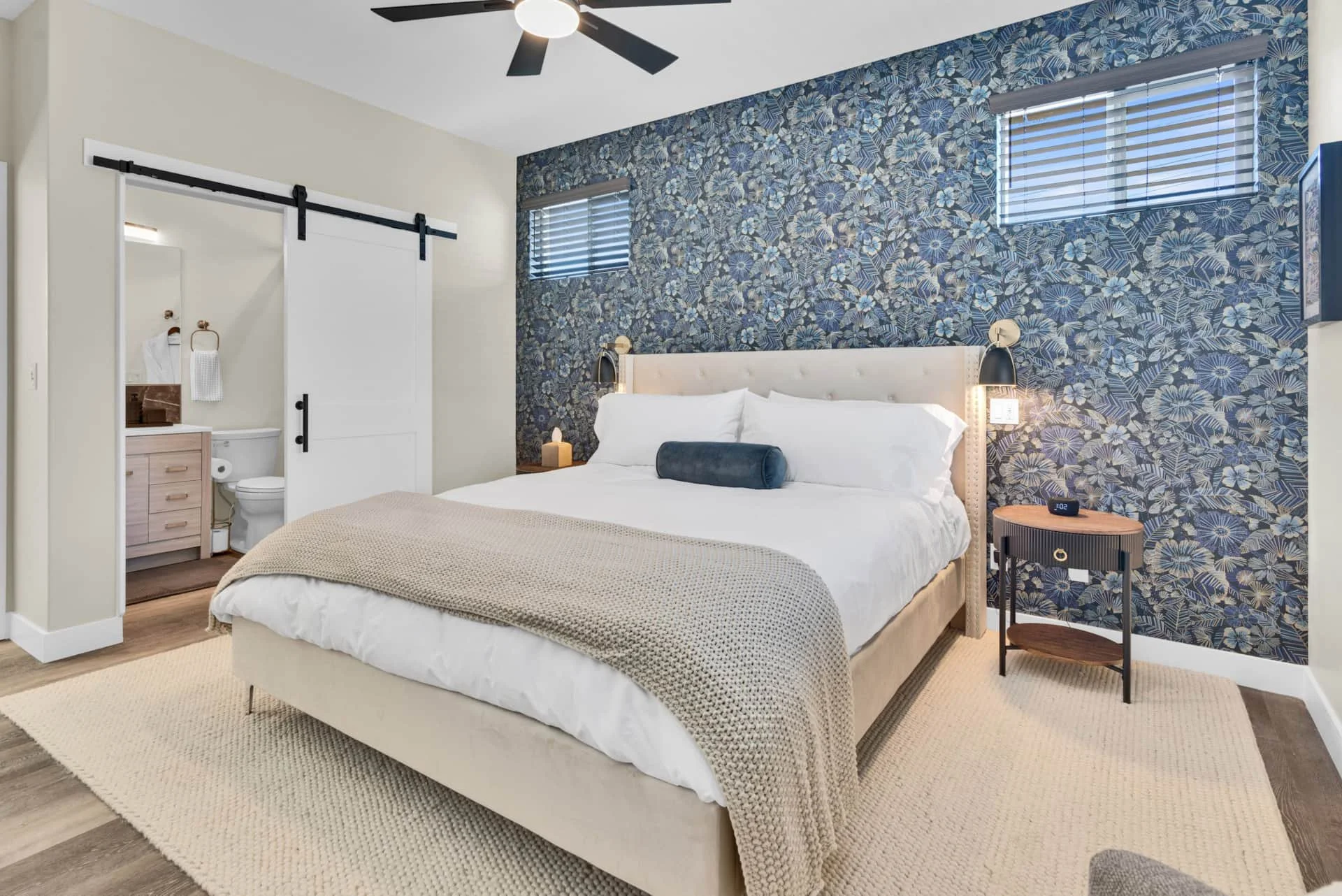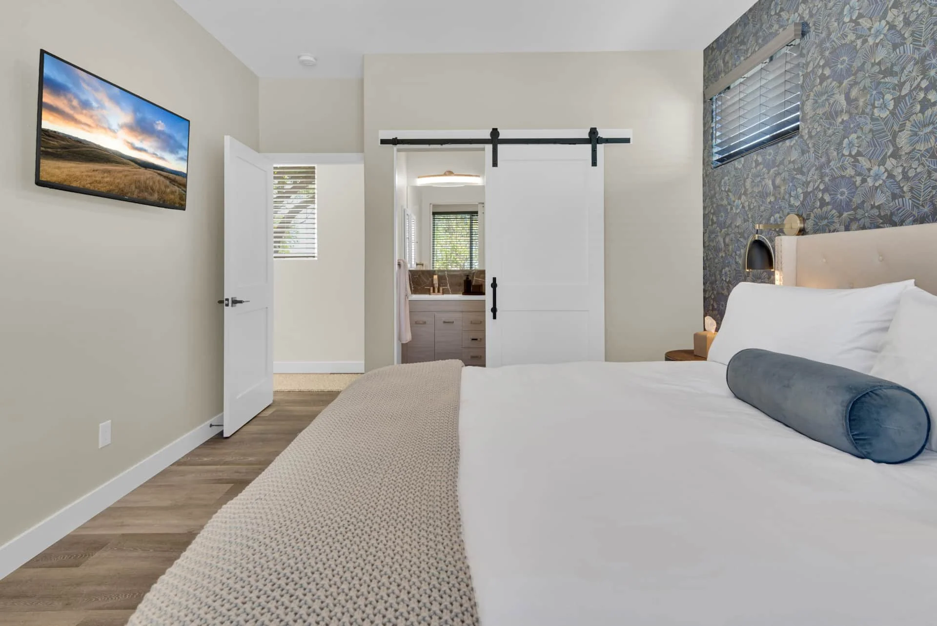 The primary suite features a king-size bed, Smart TV, reading chair, and ensuite bathroom with luxury amenities. A second bedroom with another plush king bed and Smart TV ensures every guest has a restful space to call their own. The guest bath, located in the hall, is complete with spa-like touches including robes and premium toiletries.