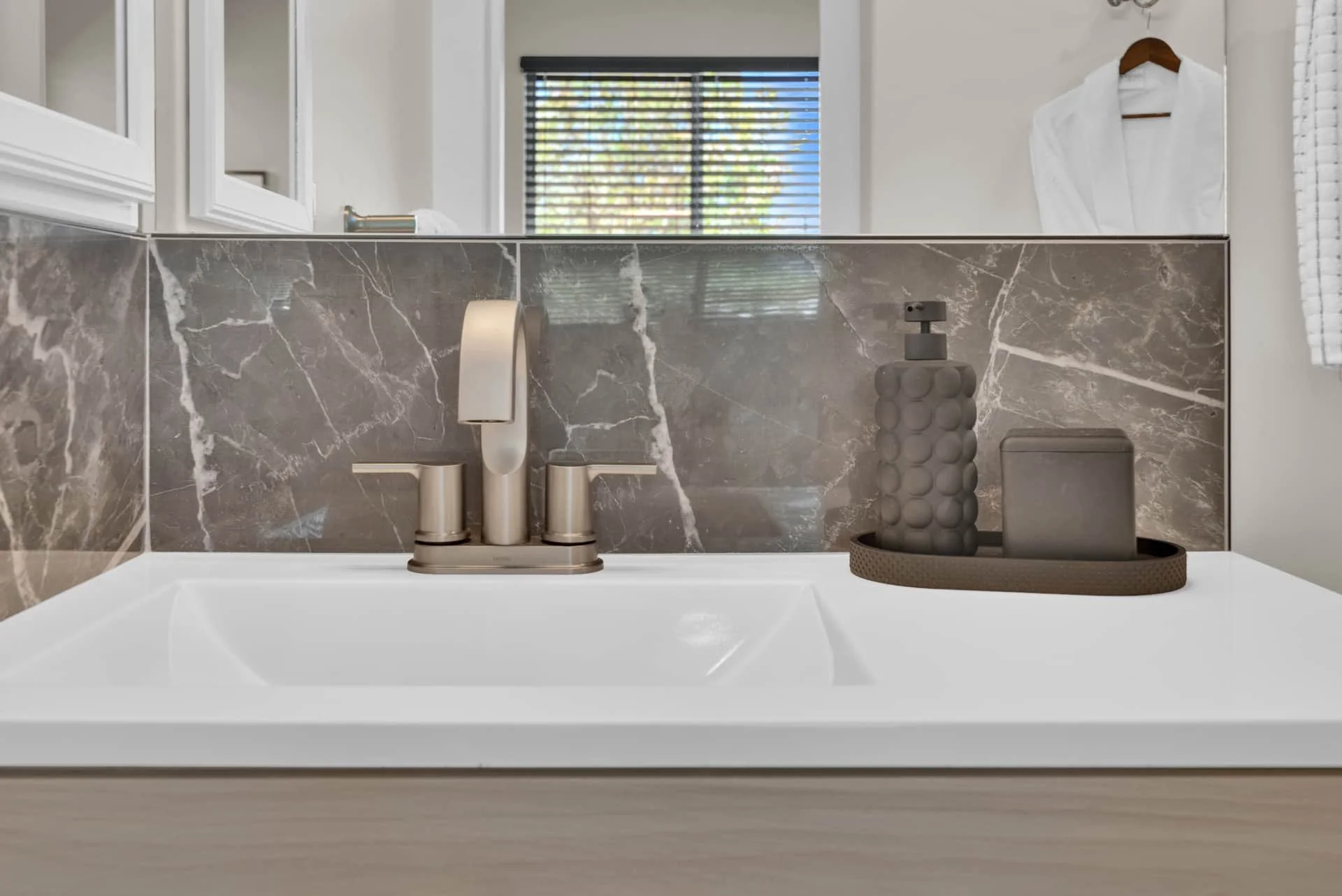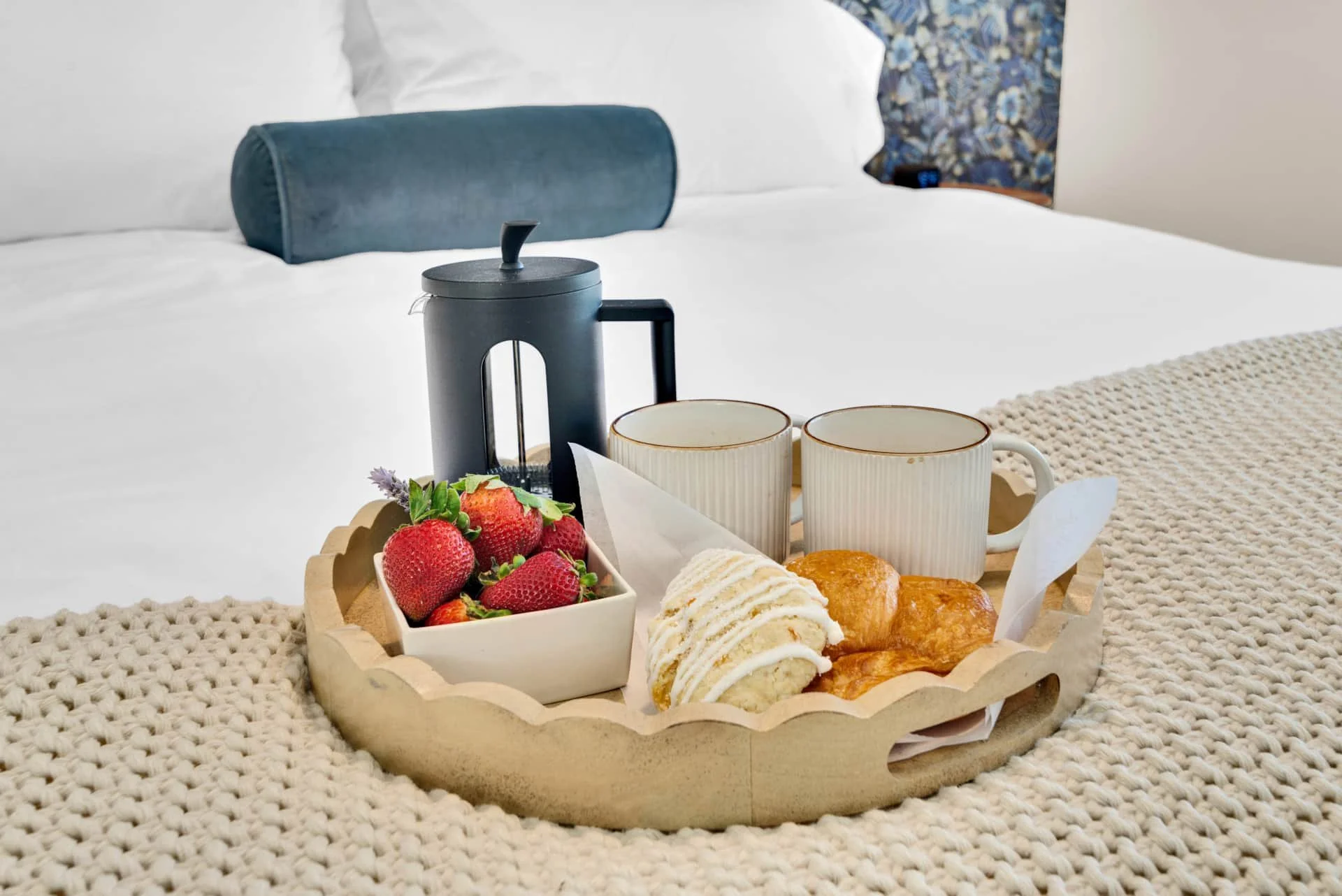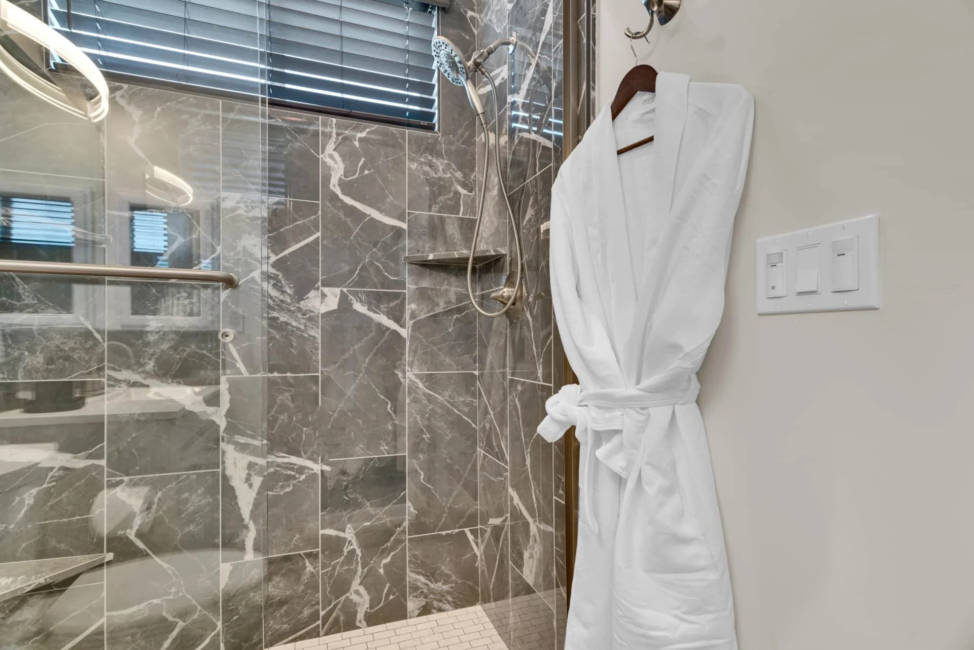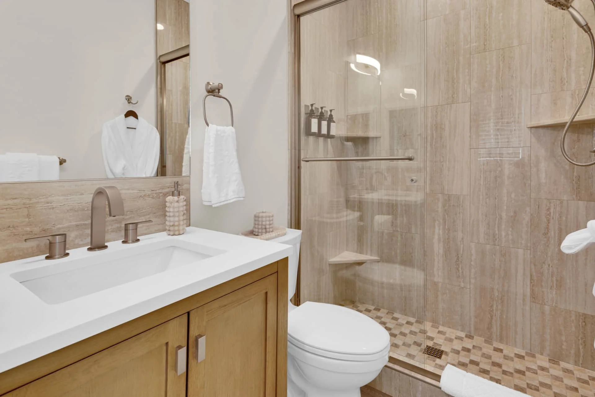The primary suite features a king-size bed, Smart TV, reading chair, and ensuite bathroom with luxury amenities. A second bedroom with another plush king bed and Smart TV ensures every guest has a restful space to call their own. The guest bath, located in the hall, is complete with spa-like touches including robes and premium toiletries.